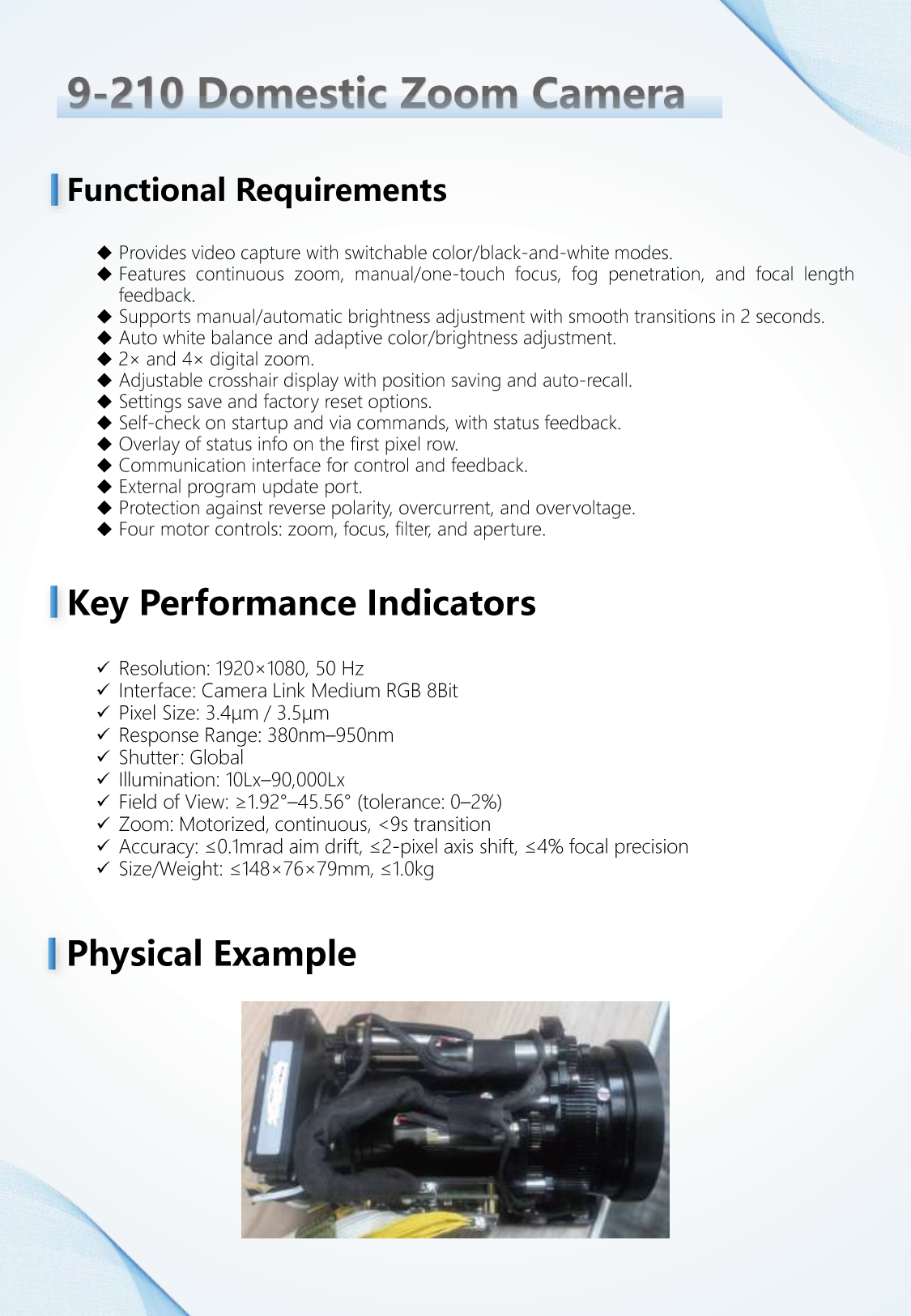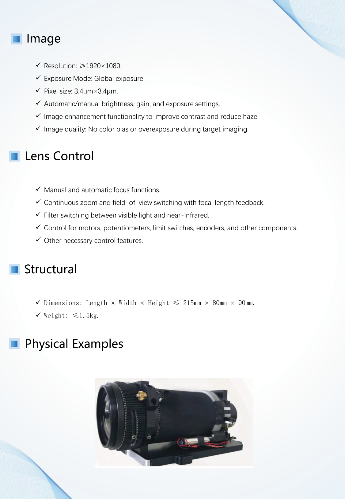 Equipped with manual/automatic dimming function (automatically adjusting exposure time and gain), and the automatic dimming process is continuous, completed within 2 seconds, with no significant fluctuation in brightness of the dimming image; The aperture is manually controllable;
